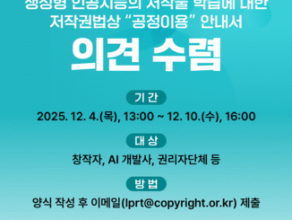 한국저작권위원회와 문화체육관광부는 안내서 설명회를 통해 공개된 ‘생성형 인공지능의 저작물 학습에 대한 저작권법상 “공정이용” 안내서에 대한 의견수렴을 실시합니다.관심있는 분들의 많은 참여 부탁드립니다. 한국저작권위원